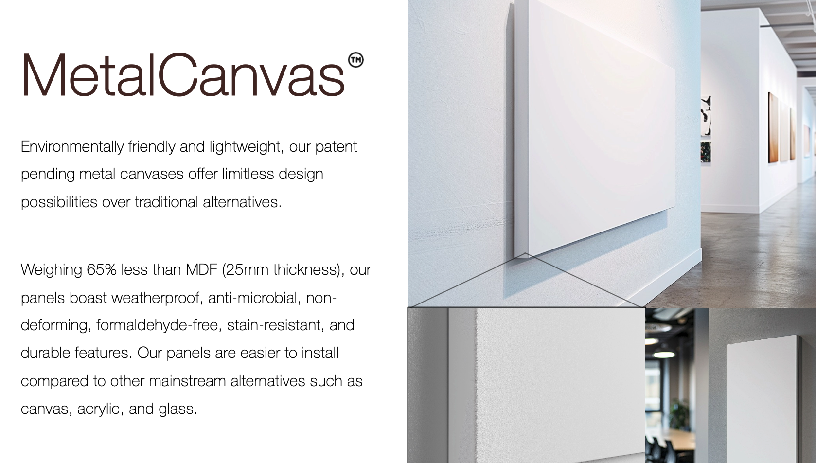 Weighing 65% less than MDF, MetalCanvas™ boasts weatherproof, magnetic, non-deforming, formaldehyde-free, stain-resistant, and durable features. MetalCanvas™ is much easier to install compared to our mainstream alternatives such as canvas, acrylic, and glass.